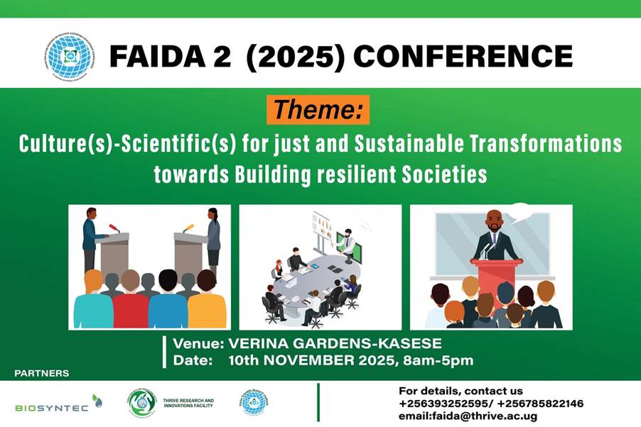 Acknowledgements: The FAIDA 2 Conference (2025) was only possible due to the kind financial and in-kind support from various institutions, in the first place THRAIF and, more specifically, the DOBOLE Academic Program, which supports the scholarship. Second, THRAIF for hosting and supporting the FAIDA secretariat; and Biosyntec Uganda: Thank you, Biosyntec Uganda, for joining to support this program. By doing so, you are making a significant contribution to the generation and sharing of innovative knowledge, as well as to mentoring scholars who will transform our society. Thank you very much to all funders and supporters, and we hope you receive more resources and maintain the same spirit of kindness towards our forthcoming events, especially FAIDA 3, 2026. The ENS Research Group, although it came on the eve of the event, did great wonders to ensure a smooth event, more specifically thanks to: Doreen and Charity Akao (who formed the rapporteur team), Mr. Lazarous Bwambale and Ms. Edwiger Naijjuka Ampurire (who formed the moderating team), Ms. Eseza Muhindo Muthahwa (who joined Janet Nderu at the reception), and Mr. Blasio Bisereko Bwambale, who joined the technical team. Thanks to Virina Gardens for the hotel services.